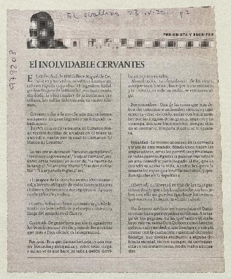 El inolvidable Cervantes [artículo] Lincoyán Rojas Peñaranda.