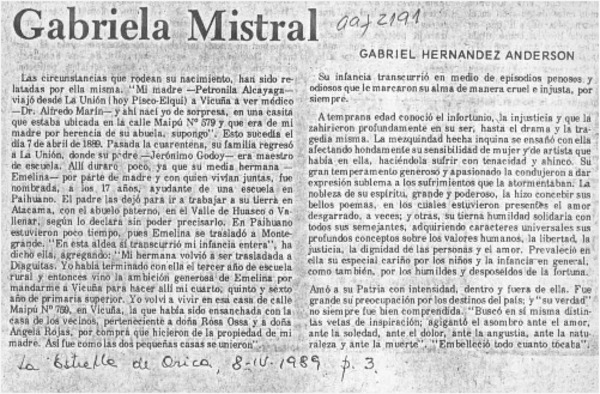 Cien años de Gabriela Mistral [artículo] Bellamín Silva.