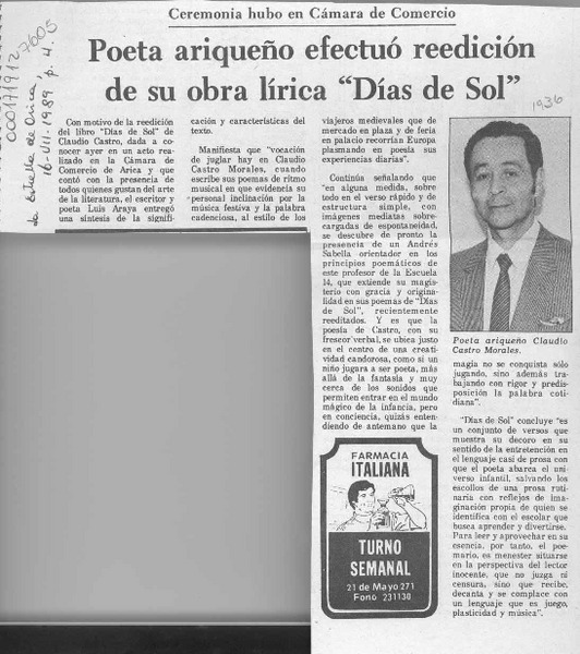 Sus primeros versos editó poeta local [artículo].