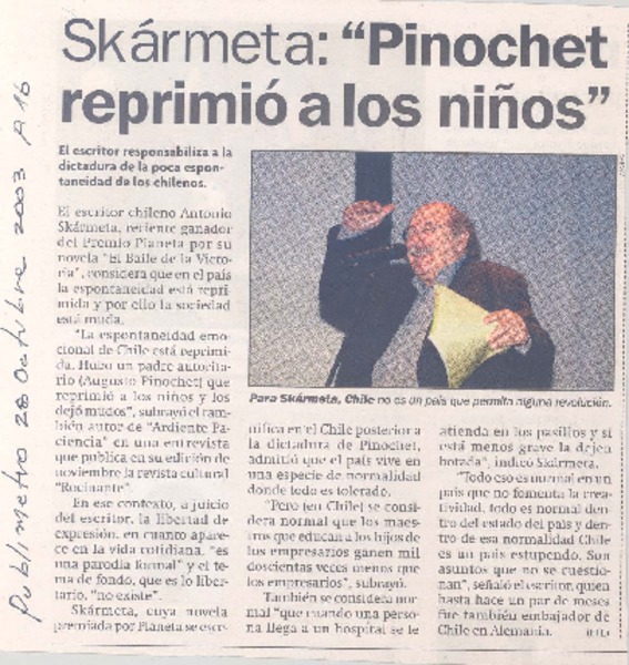 Skármeta: "Pinochet reprimió a los niños" [artículo] EFE.