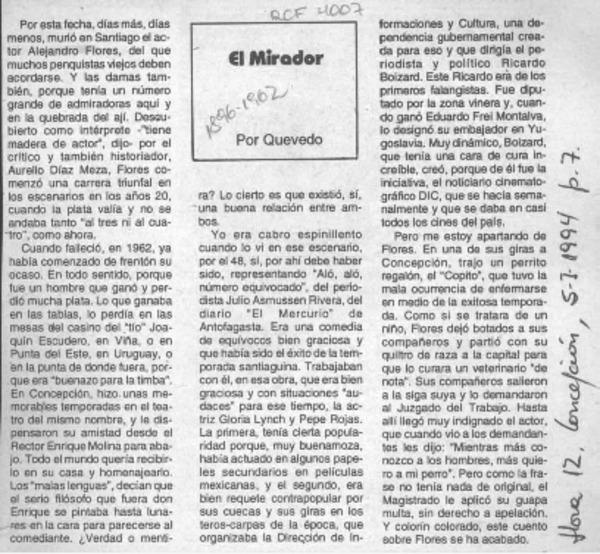 Alejandro Flores, un actor como jamás ha existido otro en Chile [artículo] Lucho Fuenzalida.