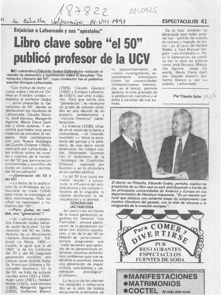 Libro clave sobre "el 50" publicó profesor de la UCV  [artículo] Claudio Solar.