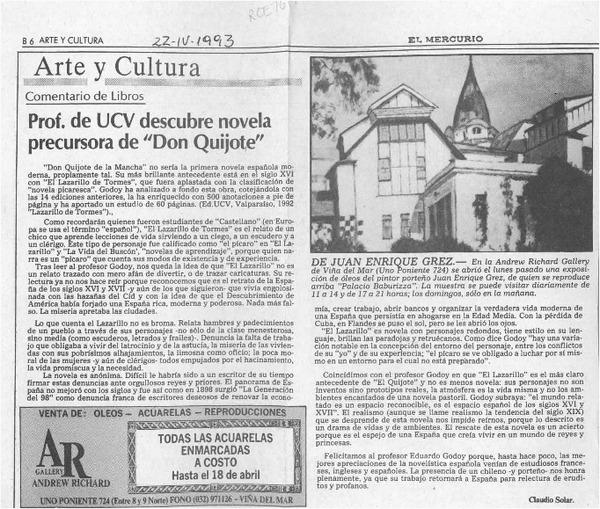Prof. de UCV descubre novela precursora de "Don Quijote" [artículo] Claudio Solar.