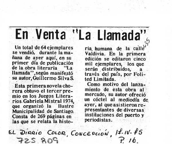 Silva Silva, Guillermo - Autores chilenos - Llamada