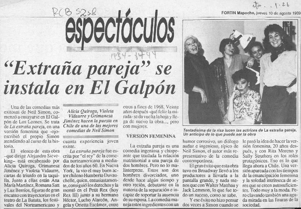 "La extraña pareja" versión con actrices en Galpón Los Leones [artículo] Yolanda Montecinos.
