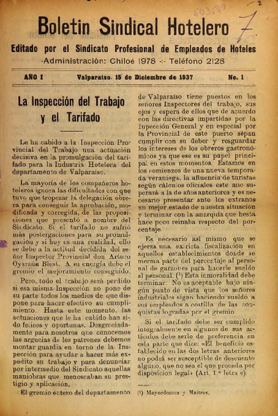 Vanguardia hotelera órgano de los trabajadores de Hoteles, Restaurants, Bares y Cafeterías.