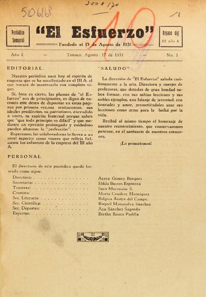 Antorcha órgano oficial de la Escuela Superior de Hombres No. 1.