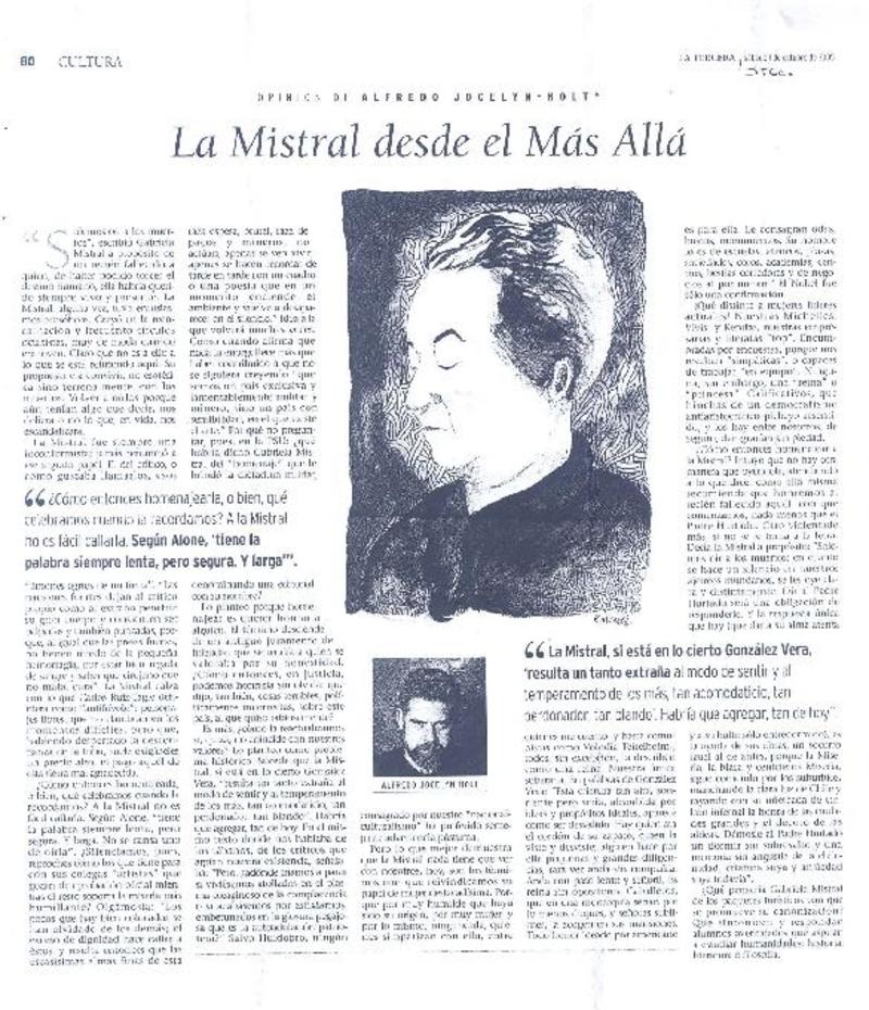 La Mistral desde el más allá [artículo] / Alfredo Jocelyn-Holt. La Tercera (Diario : Santiago, Chile)-- oct. 1, 2005, p. 80. .