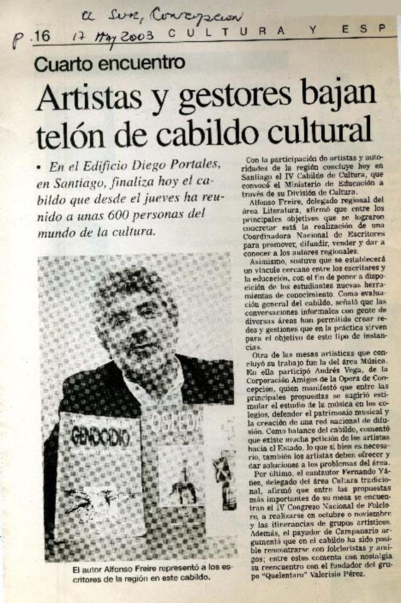 Artistas y gestores bajan telón de cabildo cultural. [artículo] El Sur (diario : Concepción, Chile)-- mayo 17, 2003, p. 16. retr. .