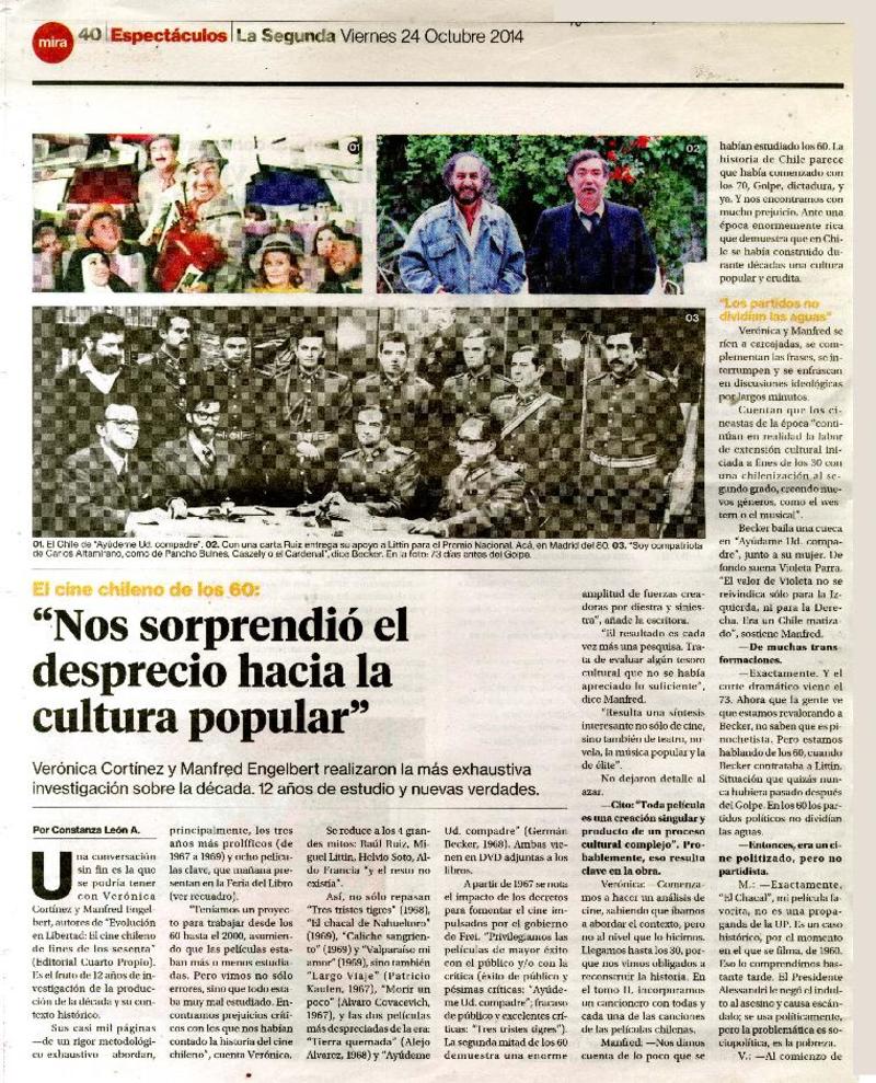 "Nos sorprendió el desprecio hacia la cultura popular" [artículo] / Constanza León A. La Segunda (Diario : Santiago, Chile) octubre 24, 2014, página 40-41 .