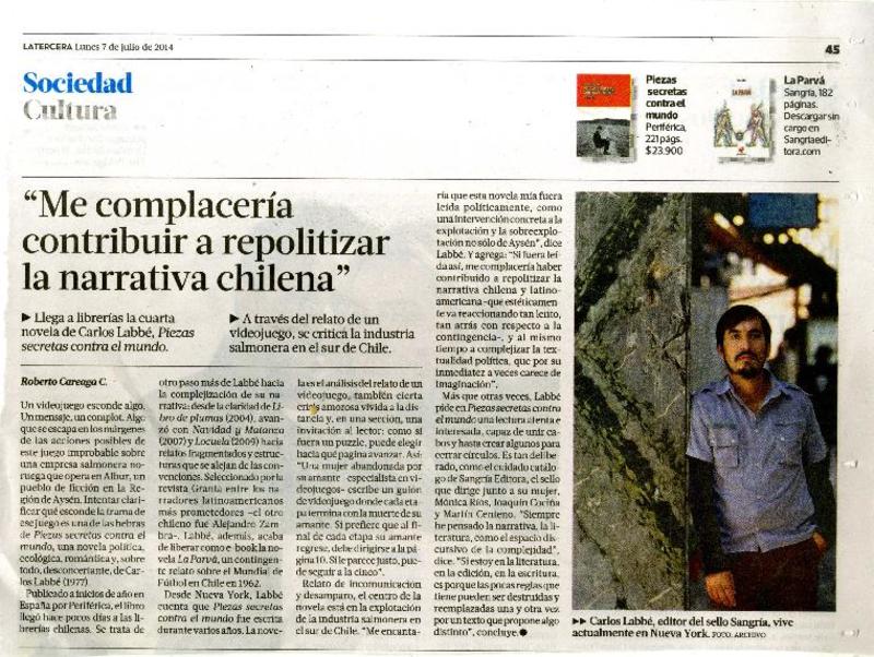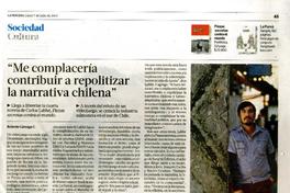 "Me complacería contribuir a repolitizar la narrativa chilena" [artículo] / Roberto Careaga C. La Tercera (Diario : Santiago, Chile)-- jul. 07, 2014, p. 45 .