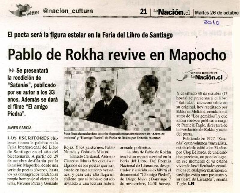 Pablo de Rokha revive en Mapocho [artículo] / Javier García. La Nación (Diario : Santiago, Chile)-- oct. 26, 2010, p. 21. .