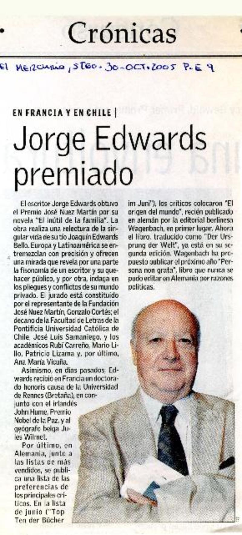 Jorge Edwards premiado [artículo]. El Mercurio (Diario: Santiago, Chile) oct. 30, 2005, p. E9 .