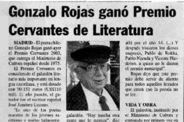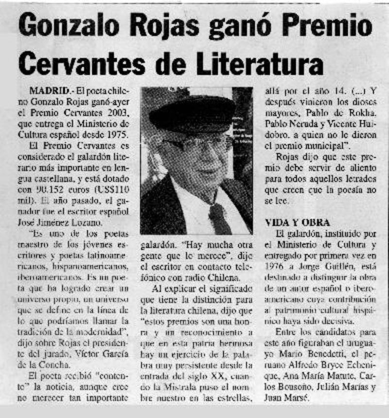 Gonzalo Rojas ganó Premio Cervantes de Literatura. [artículo] La Estrella de Arica (Arica, Chile)-- dic. 11, 2003, p. A 24. retr. .