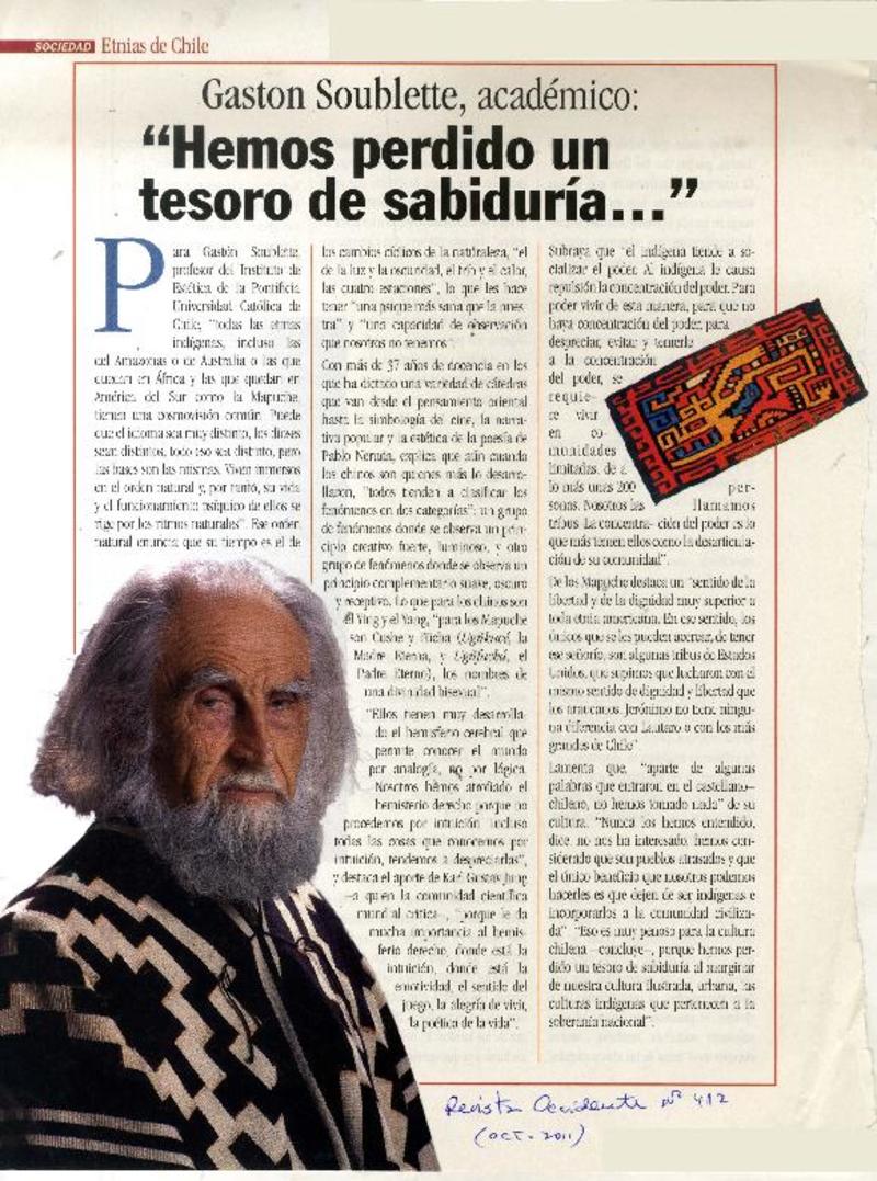 "Hemos perdido un tesoro de sabiduría...". [artículo] Revista Occidente (Revista : Santiago, Chile)-- no 412 (oct. 2011), p. 20. .