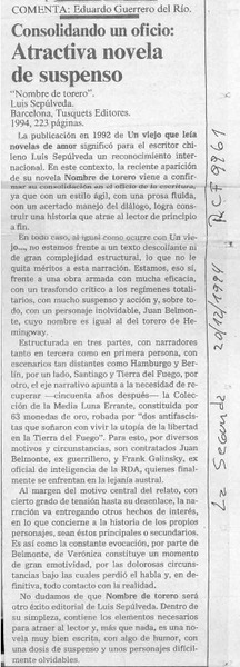 Consolidando un oficio, atractiva novela de suspenso [artículo] Eduardo Guerrero del Río.