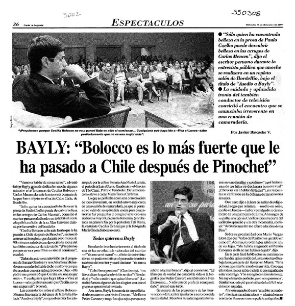Bayly, "Bolocco es lo más fuerte que le ha pasado a Chile después de Pinochet" [artículo] Javier Ibacache V.