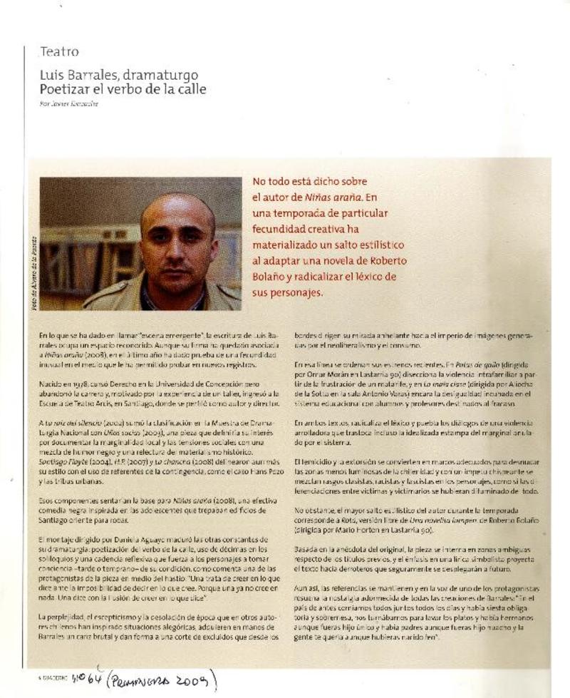 Luis Barrales, dramaturgo : poetizar el verbo de la calle [artículo] Javier Ibacache.