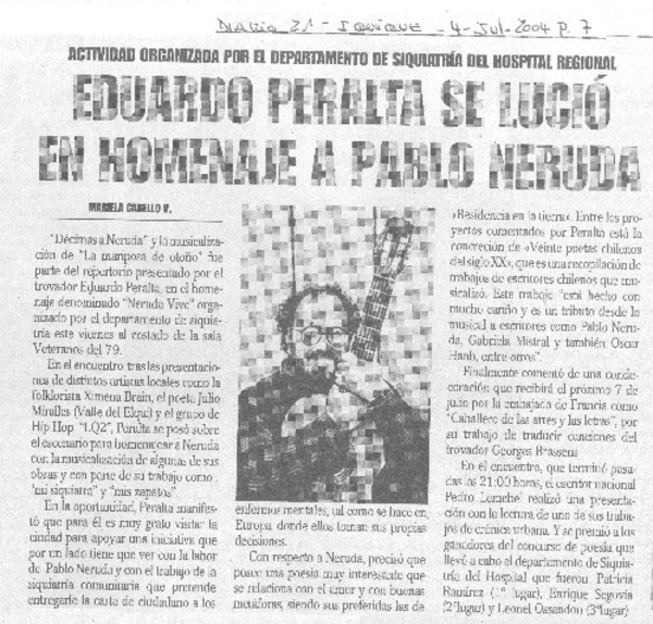 Eduardo Peralta se lució en homenaje a Pablo Neruda [artículo] Mariela Cabello V.