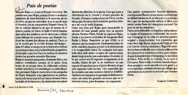 Gonzalo Rojas : sobre premio Cervantes : "contento, aunque sé que no lo merezco" [artículo].