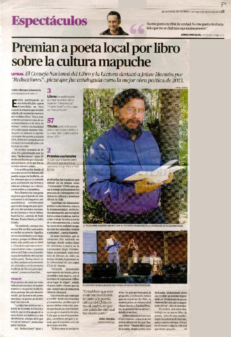 Premian a poeta local por libro sobre la cultura mapuche [artículo] Pablo Obreque Echeverría