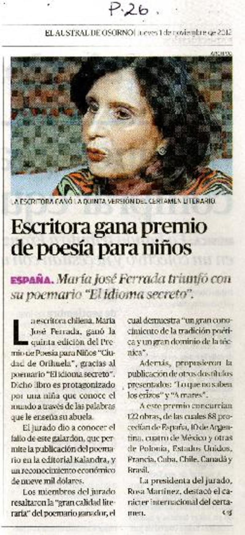 Escritora gana premio de poesía para niños. [artículo]