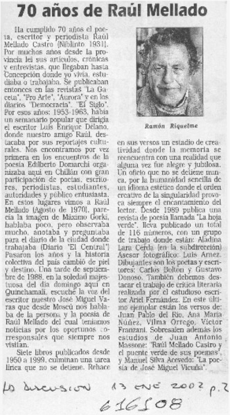70 años de Raúl Mellado [artículo] Ramón Riquelme