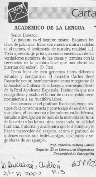 Académico de la Lengua [artículo] Federico Pastene Labrín
