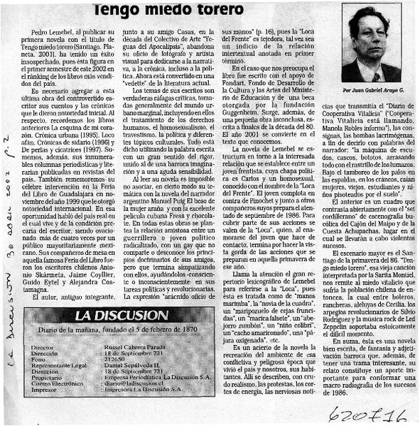 Tengo miedo torero [artículo] Juan Gabriel Araya G.