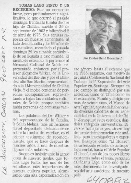 Tomás Lago Pinto y un recuerdo [artículo] Carlos René Ibacache I.