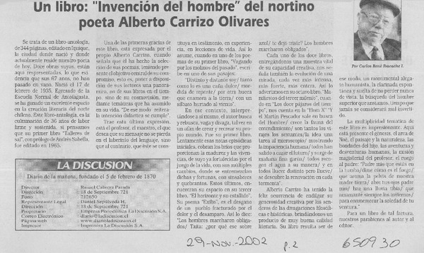 Un libro, "Invención del hombre" del nortino poeta Alberto Carrizo Olivares [artículo] Carlos René Ibacache I.