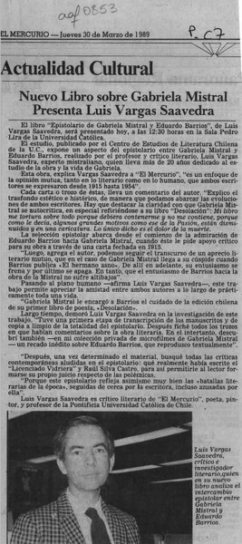 Nuevo libro sobre Gabriela Mistral presenta Luis Vargas Saavedra  [artículo].