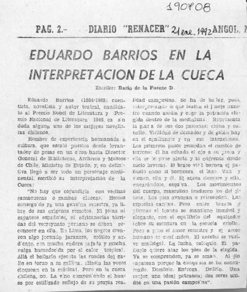 Eduardo Barrios en la interpretación de la cueca  [artículo] Darío de la Fuente D.
