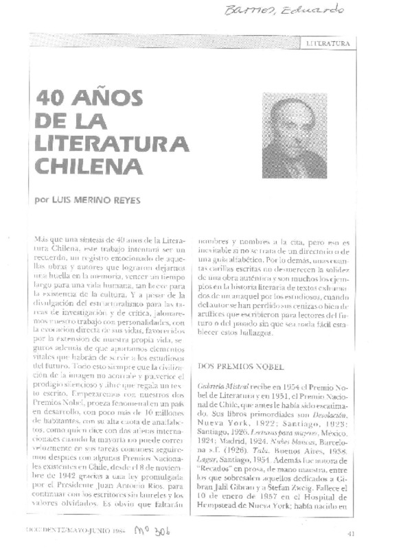 40 años de la literatura chilena [artículo] Luis Merino Reyes.