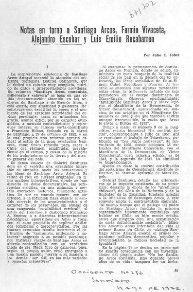 Notas en torno a Santiago Arcos, Fermín Vivaceta, Alejandro Escobar y Luis Emilio Recabarren [artículo] Julio C. Jobet.