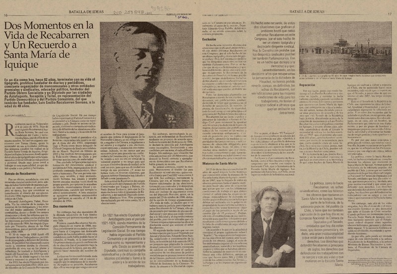 Dos momentos en la vida de Recabarren y un recuerdo a Santa María de Iquique [artículo]Alejandro Navarro.