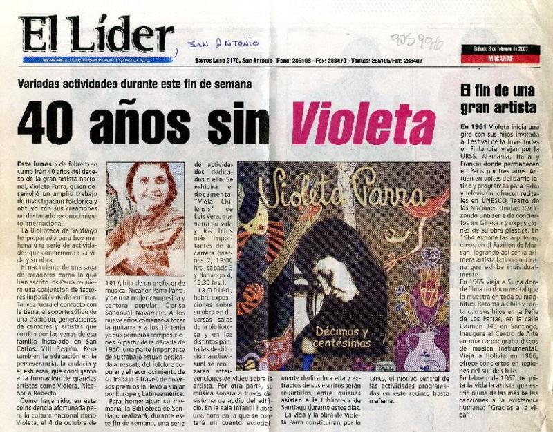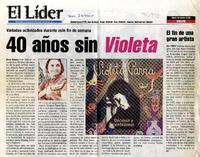 40 años sin Violeta [artículo] / El Líder (San Antonio, Chile)-- feb. 3, 2007, p. 24. .