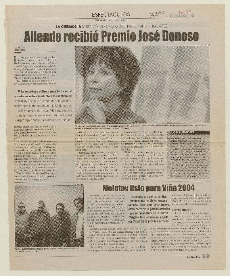 Allende recibió Premio José Donoso. [artículo] La Nación (Diario : Santiago, Chile)-- dic. 5, 2003, p. 29. retr. .