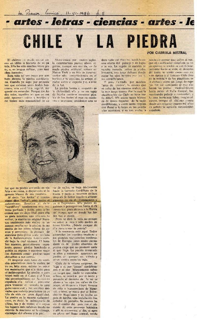 Chile y la piedra [artículo] / La Prensa (Diario : Curico, Chile)-- jun. 11, 1986, p. 5. .