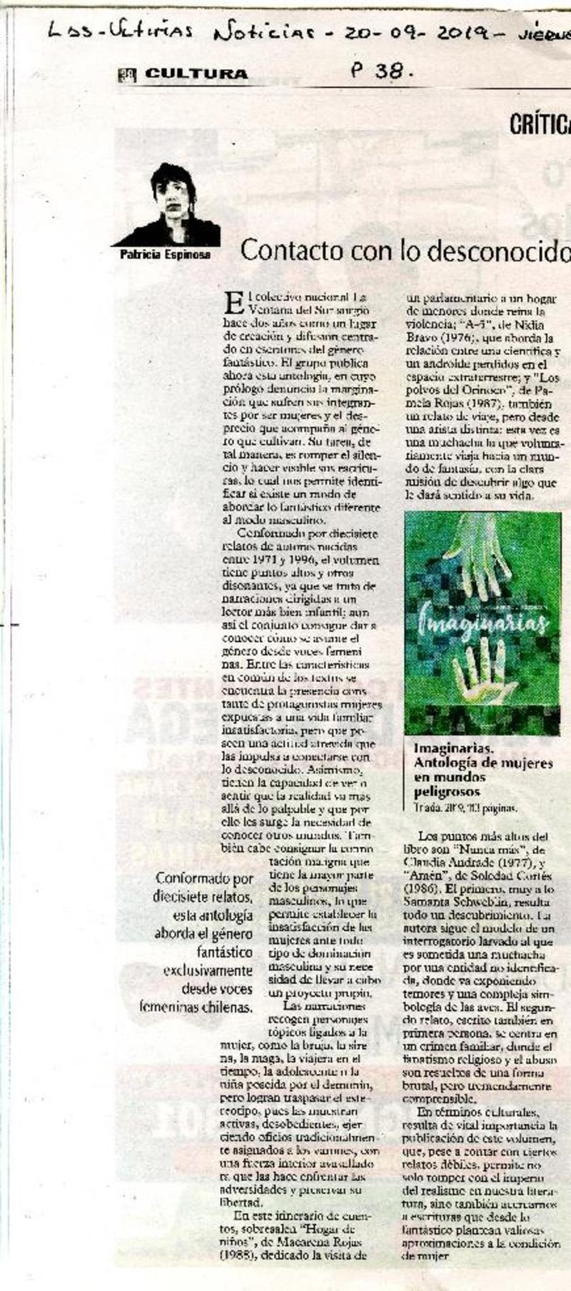 Contacto con lo desconocido [artículo] / Patricia Espinosa. Las Últimas Noticias (Diario : Santiago, Chile)-- sept. 20, 2019, p. 38. .
