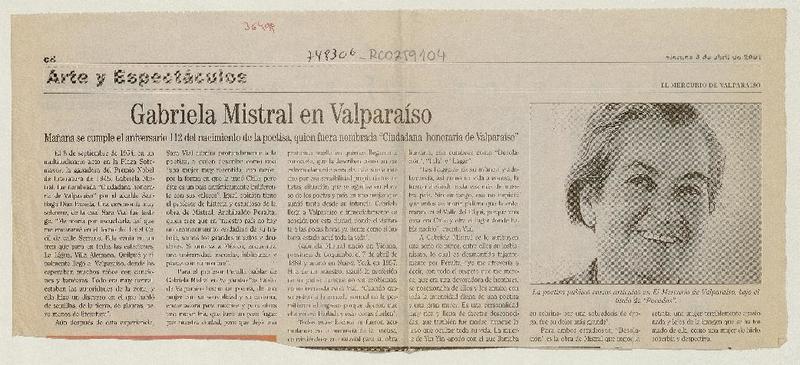 Gabriela Mistral en Valparaíso. [artículo] El Mercurio (Diario : Valparaíso, Chile)-- abr. 6, 2001, p. C8. retr. .