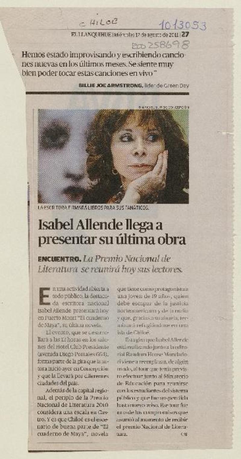 Isabel Allende llega a presentar su última obra [artículo]. El Llanquihue (Diario : Puerto Montt, Chile)-- ago. 17, 2011, p. 27 .