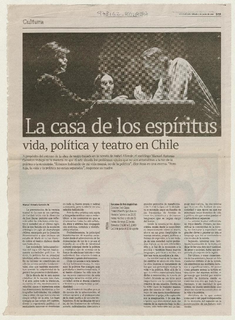 La casa de los espíritus, vida, política y teatro en Chile [artículo] Manuel Antonio Garretón M.