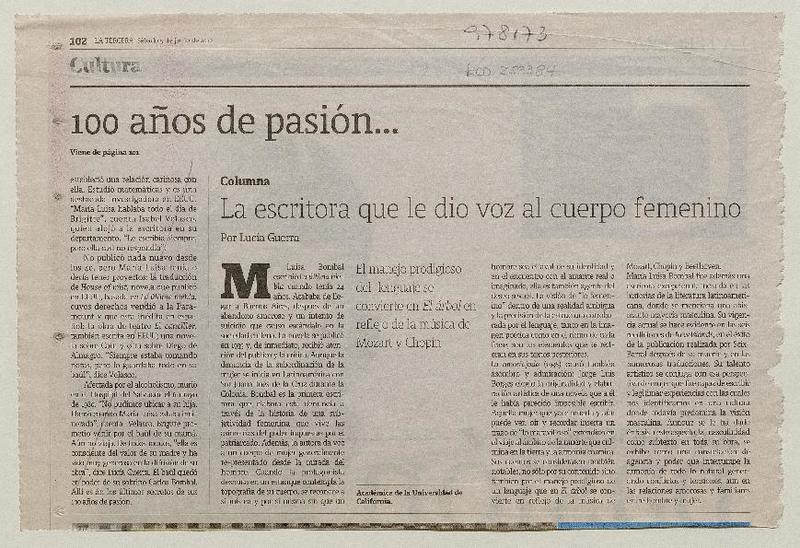 La escritora que le dio voz al cuerpo femenino [artículo] / Lucía Guerra. La Tercera (Diario : Santiago, Chile)-- jun. 5, 2010, p. 102. .