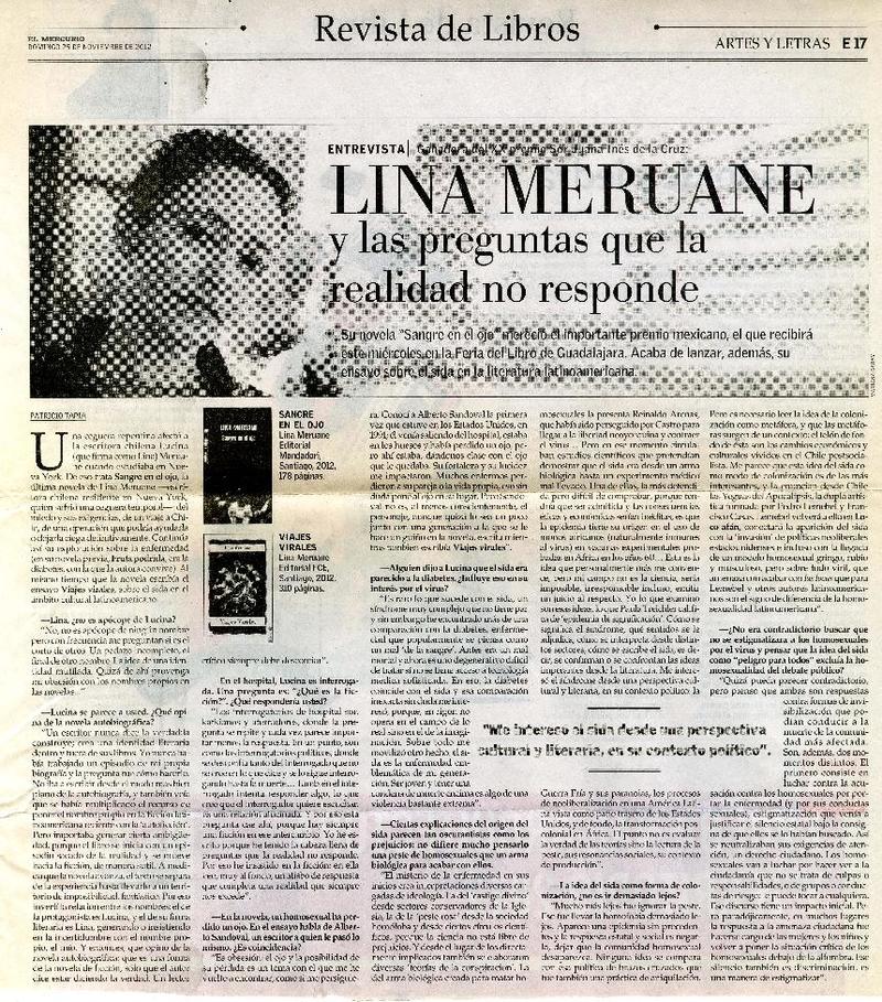 Lina Meruane y las preguntas que la realidad no responde [entrevista] / [artículo] : Patricio Tapia. El Mercurio (Diario : Santiago, Chile)-- nov. 25, 2012, p. E17 (suplemento "Artes y Letras""Revista de Libros") .