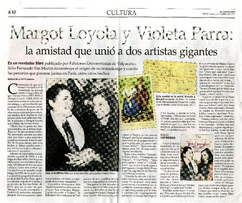 Margot Loyola y Violeta Parra: la amistad que unió a dos artistas gigantes [artículo] / Romina de la Sotta Donoso. El Mercurio (Diario : Santiago, Chile)-- sept. 21, 2019, p. A12. .