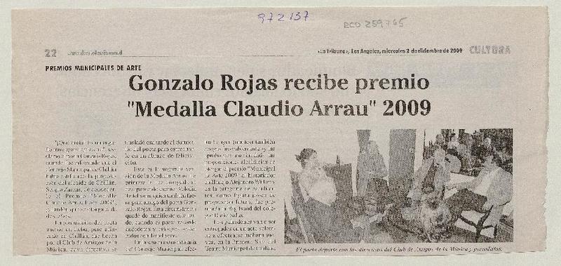 Gonzalo Rojas recibe premio "Medalla Claudio Arrau" 2009 [artículo]. La Tribuna (Diario : Los Angeles, Chile)-- dic. 2, 2009, p. 22. .