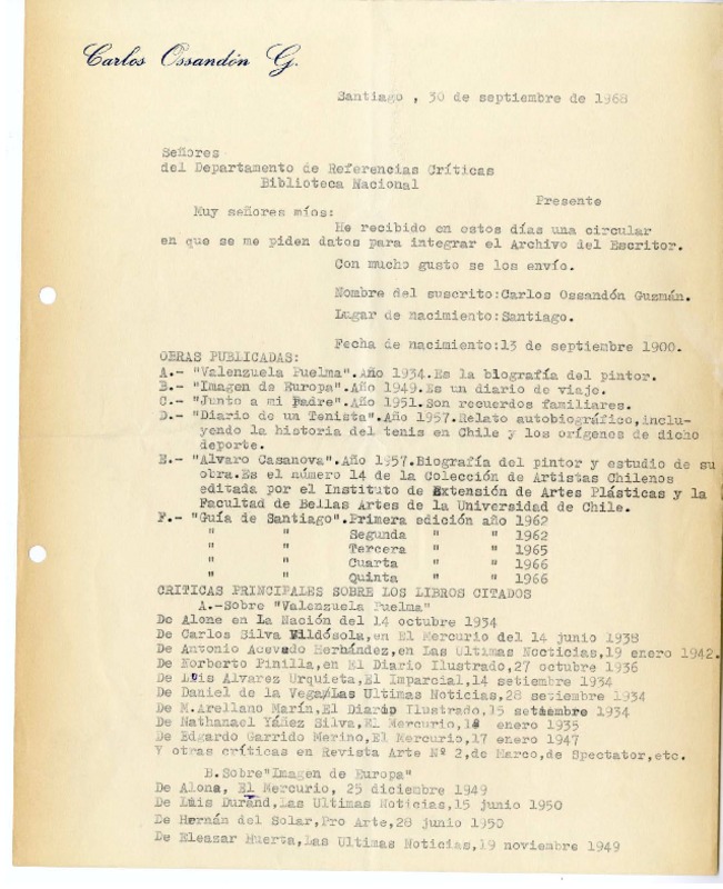 Inicio / Fondos y Colecciones / Archivo del Escritor / Colecciones / Carlos Ossandón Guzmán