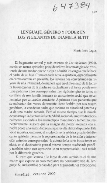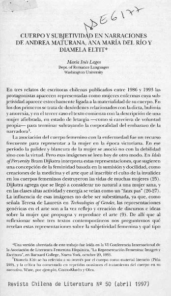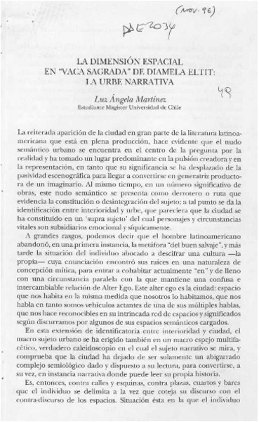 Nomadismo y conjetura, utopías y mentira en Vaca sagrada de Diamela Eltit [artículo] Claudine Potvin.