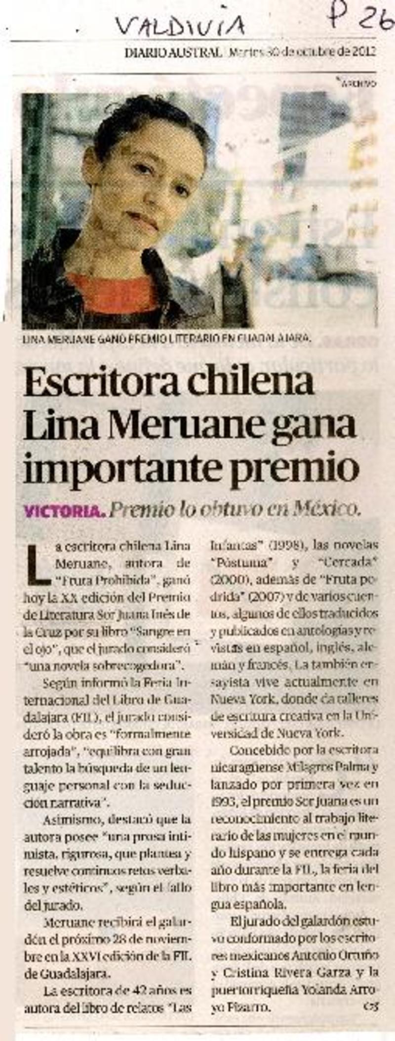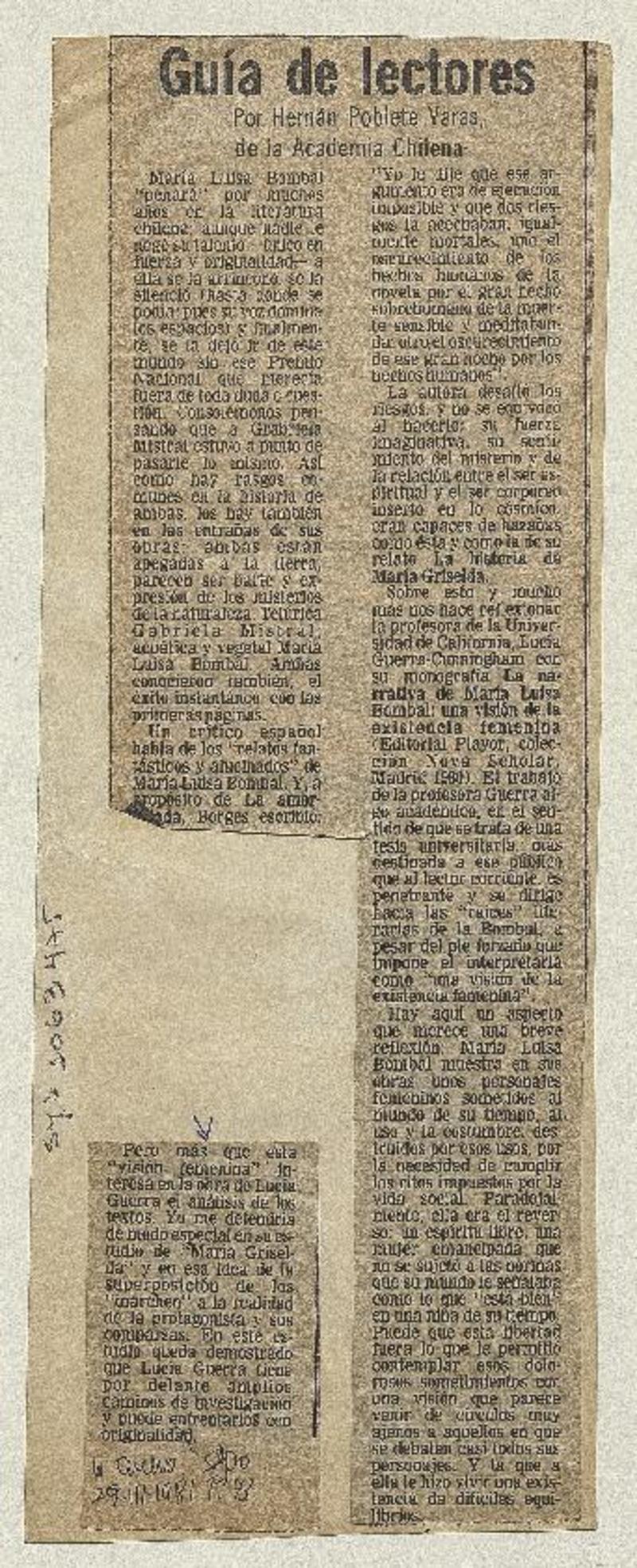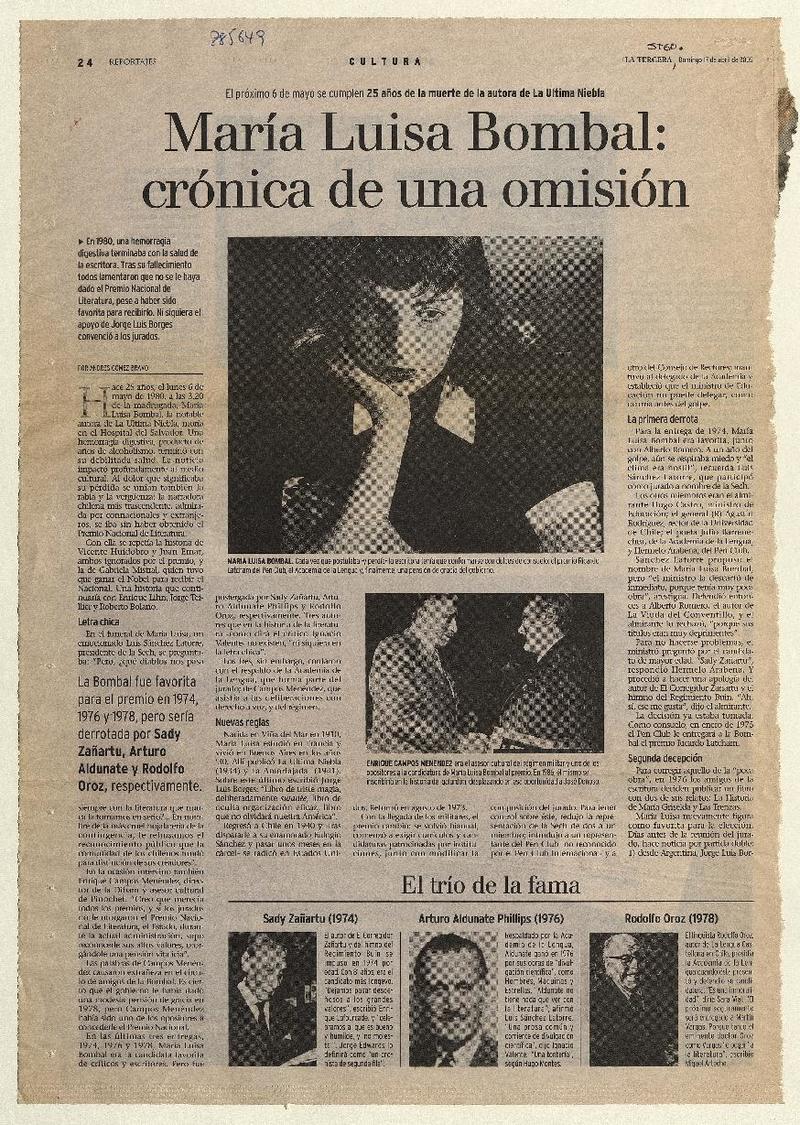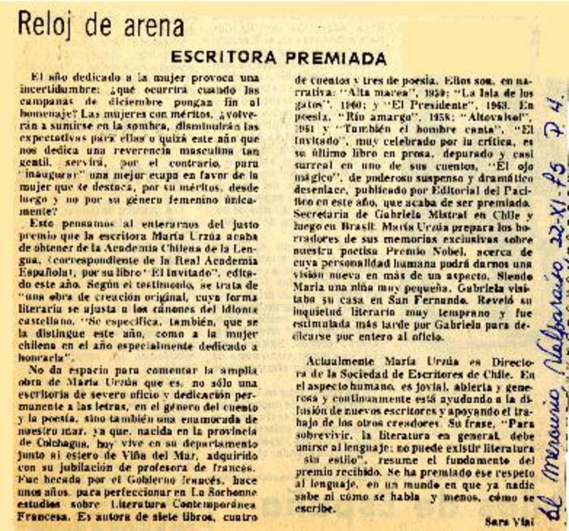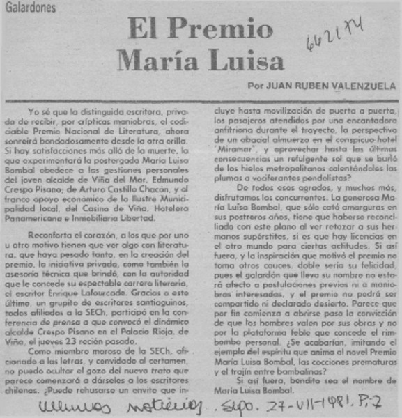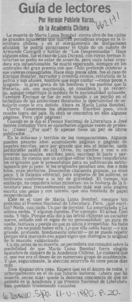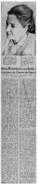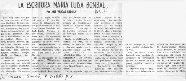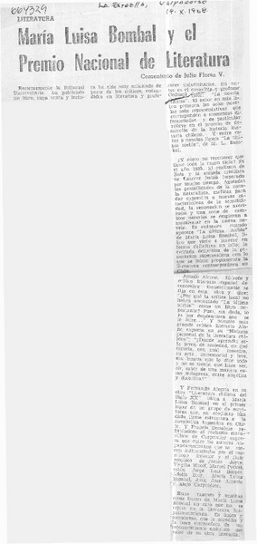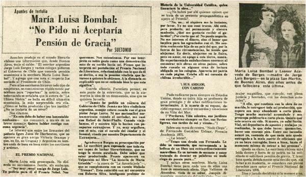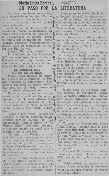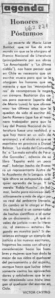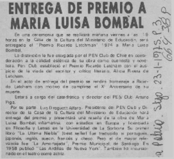 Academia chilena premió obra de María L. Bombal. [artículo]